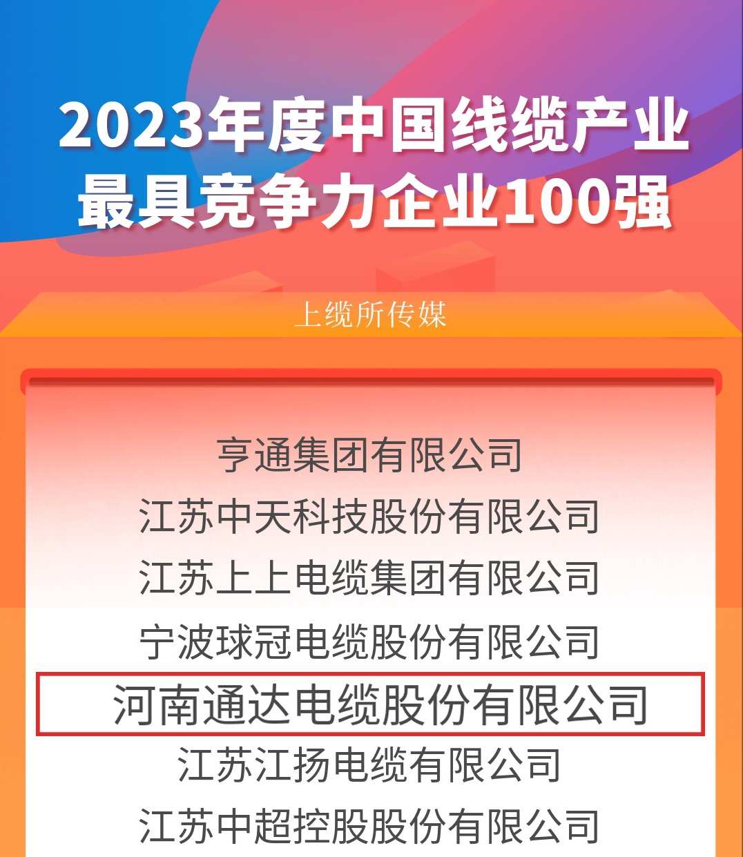 2023年9月3日,“2023年度中国线缆产业最具竞争力企业”授牌仪式在万众瞩目中隆重举行,河南快猫官网WWW在线观看电缆股份有限公司荣登“2023年度中国线缆产业最具竞争力企业100强”榜单,至今快猫官网WWW在线观看已经连续七年荣获中国线缆产业最具竞争力百强企业。