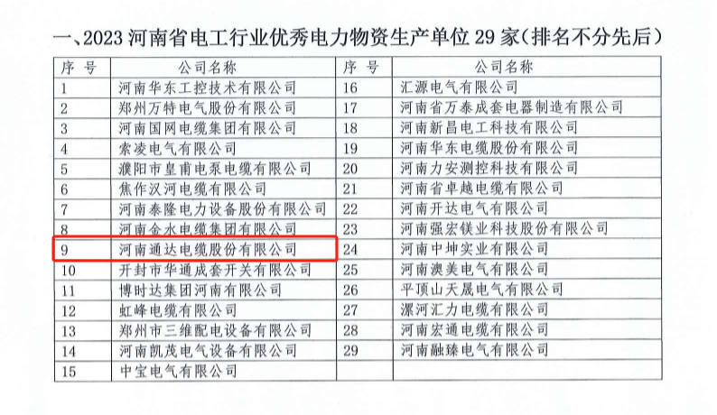 1月8日,河南省电工行业协会发布关于2023年度河南省电工行业优秀电力施工单位、电力物资生产单位评审结果的通知,河南快猫官网WWW在线观看电缆股份有限公司荣登2023年度河南省电工行业优秀电力物资生产单位榜单。