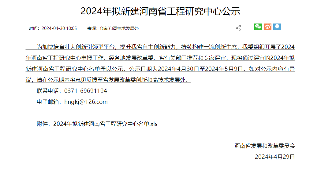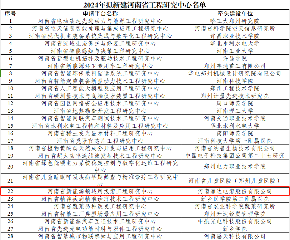 近期,河南省发展和改革委员会公示《2024年拟新建河南省工程研究中心》,公司申报的“河南省新能源领域用线缆工程研究中心”成功入选。