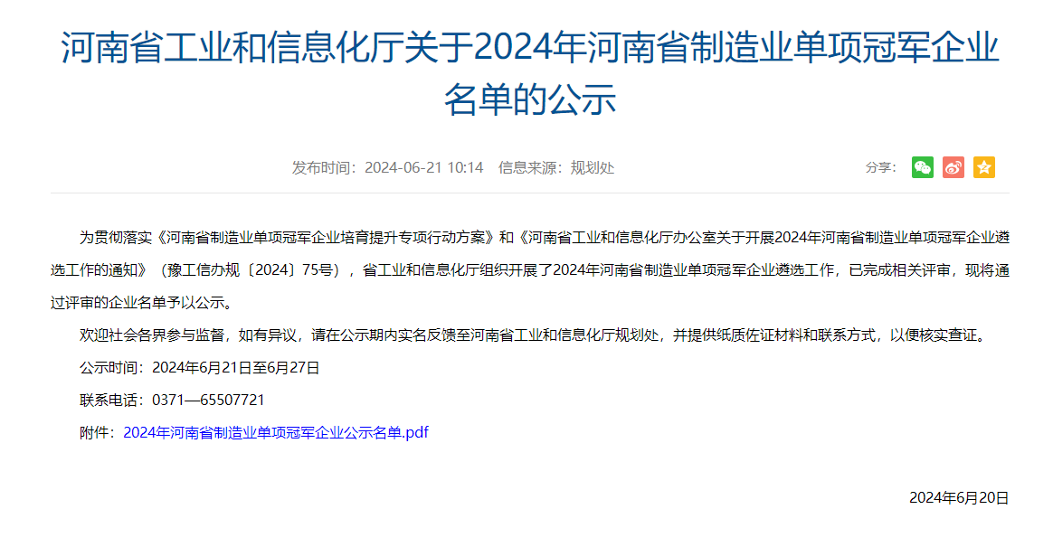 河南省制造业单项冠军企业,是指长期专注于制造业某些特定细分产品市场,生产技术或工艺国际领先,单项产品市场占有率位居全省或国内前列的企业,代表了国内制造业细分领域产业发展的高水平。省级制造业单项冠军企业(产品)每3年复核评估1次,省级制造业单项冠军培育企业(产品)每年更新1次。