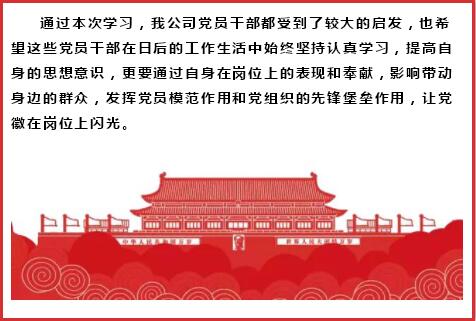 为深入学习宣传贯彻习近平新时代中国特色社会主义思想和党的十九大精神,让党的创新理论成果深入人心,切实把党的十九大精神落到实处,我公司党委积极配合上级党组织的活动,积极组织公司全部党员参与学习党的创新理论。