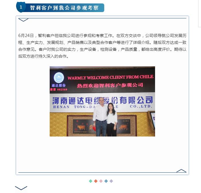 【概要描述】6月24日,智利客户莅临我公司进行参观和考察工作。在双方交谈中,公司领导就公司发展历程、生产实力、发展规划、产品销售以及典型合作客户等进行了详细介绍。随后双方达成一致合作意见。客户对我公司的实力,生产设备,检测设备,产品质量,都给出高度评价。期待以后双方进行持久深入的合作。